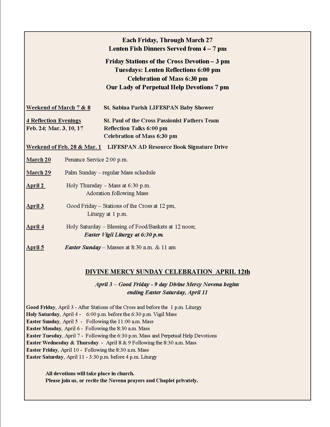 Divine Child Catholic Church, Dearborn • Sacred Heart Catholic Church, Dearborn • St. Anselm Catholic Church, Dearborn Heights • St. Linus Catholic Church, Dearborn Heights • St. Sabina Catholic Church, Dearborn Heights